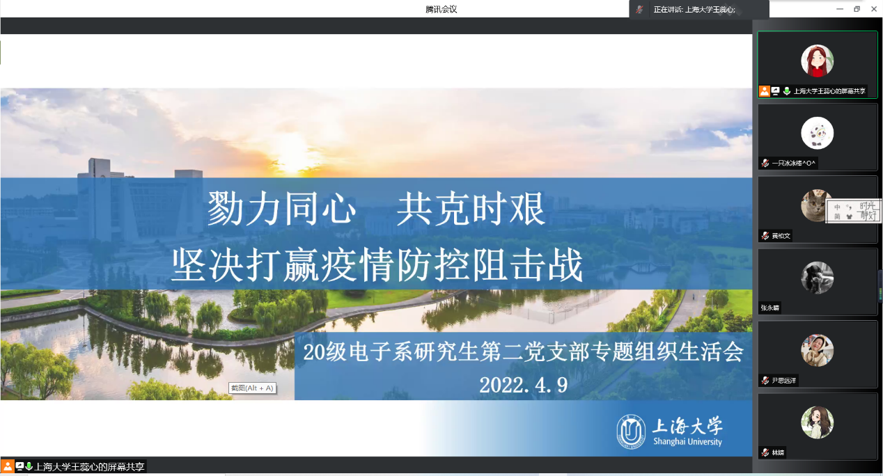2020级电子系研究生第二党支部线上召开疫情防控专题组织生活会。支部书记王蕊心倡议全体党员要做到三个“务必”,务必充分认识疫情形势得严峻性和复杂性,严格遵守公司各项防疫规定;务必充分发挥先锋模范作用,带头联系服务群众,着力了解和解决员工们的需求和困难;务必冲锋在前,勇挑重担,率先垂范,以实际行动践行党员的责任与义务。与会党员分享参与疫情防控工作的体会和经验。支部党员张永晴,蒋怡彬在志愿服务中“身兼数职”,维护核酸秩序,参与南区巡逻,协助楼宇事务,始终坚守岗位,做好一颗“螺丝钉”。