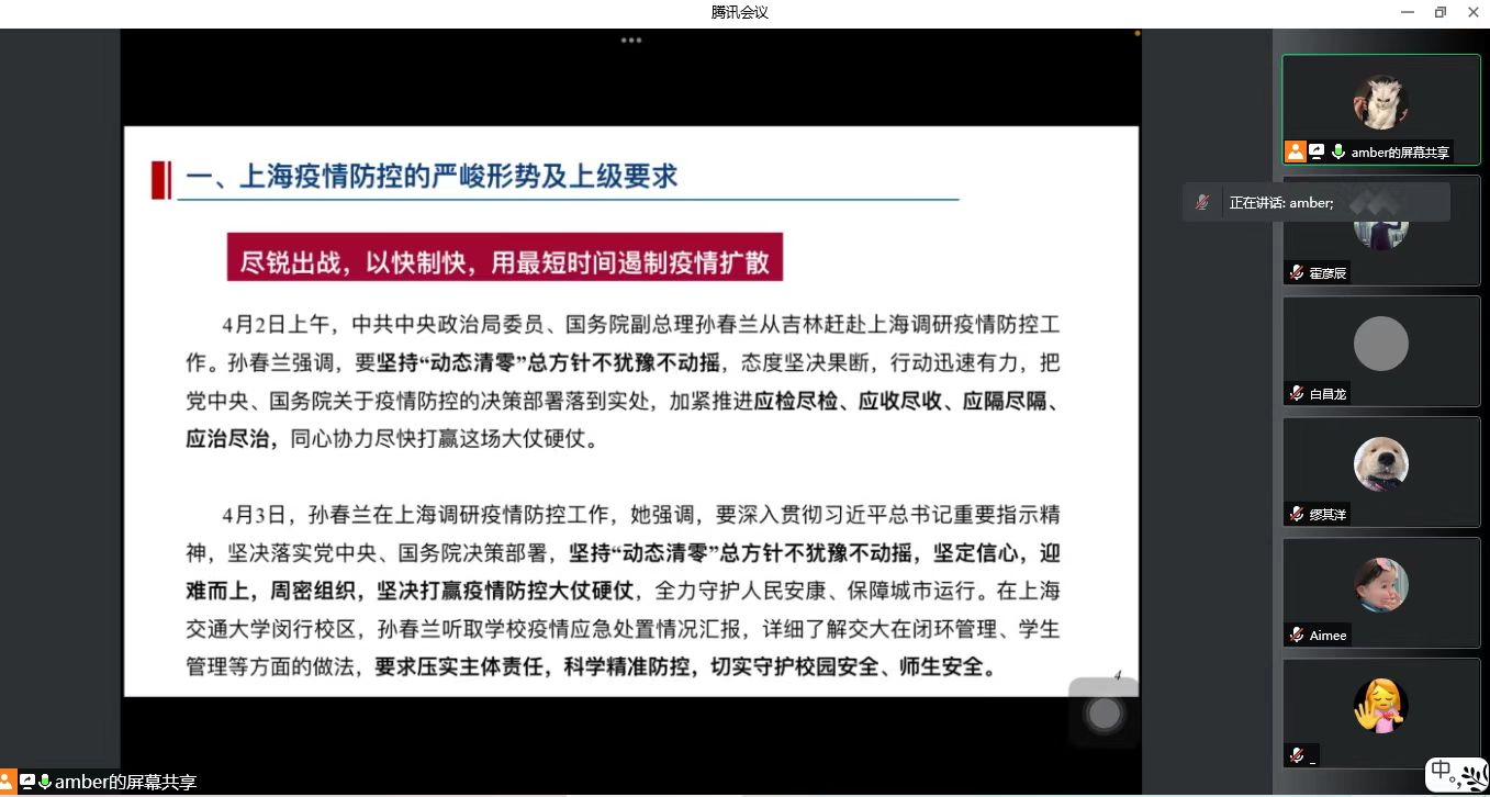 2020级高分子系研究生党支部开展主题为“戮力同心,共克时艰,坚决打赢疫情防控阻击战”组织生活会。支部书记姚可传达了当前上海市和公司防控要求,倡议党员同志在疫情防控期间做到“一个支部就是一座堡垒,一名党员就是一面旗帜”的带头作用。党员霍彦辰、李启航已加入党员突击队,其他党员虽然在楼宇封控,依然要积极发挥作用,安抚同学情绪,缓解身心压力。相信我们终会战胜疫情,迎来胜利。