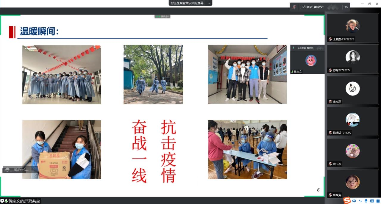 2021级材料所研究生党支部党员与入党积极分子齐聚线上,围绕“疫情防控形势下的责任与担当”开展交流,党员黄宗文总结分享了班级同学抗疫事迹及志愿服务的感悟。支部书记陶轶琦向全体同志发出倡议,与会全员围绕“党员先锋模范作用”开展热烈讨论,主动将思想和行动统一到打赢疫情防控阻击战、平安校园保卫战这场硬仗上来。