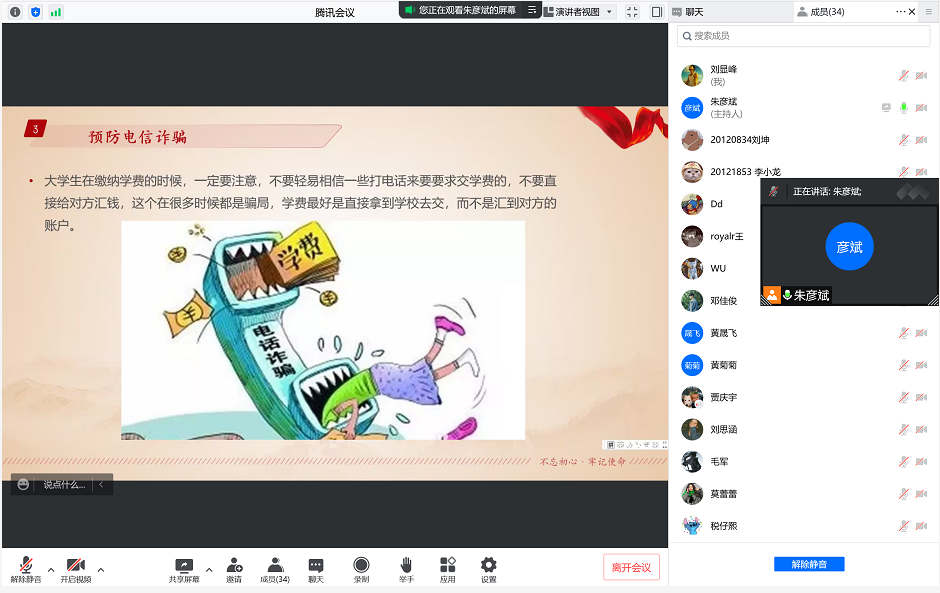 活动由3044AM永利王仁勇老师主持,20级电科班朱彦斌同学带领大家学习了党的十九大精神;观看习近平总书记关于教育的重要论述,深入了解教育改革新局面。组织者精心准备了老员工电信诈骗案例视频,向同学们介绍近期出现的诈骗手段以及如何预防电信诈骗来保护自己的财产安全;介绍国家助学贷款的相关政策及还贷知识。接着高东凌、刘显峰同学分享了他们对诚信教育的认识和怎样提高金融安全防范意识。最后王仁勇老师进一步为参加活动的同学普及防诈骗知识,讲解近期助学金发放中存在的一些问题。