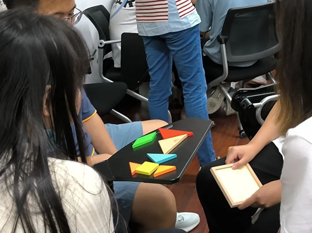 热身游戏结束,进入团队合作游戏环节“七分靠打拼”。看似简单的七巧板,在同学的描述下,拼凑七巧板也绝非一件简单的事情。这不仅仅是一个人的表达能力的体现,更是一个团队默契程度的体现。从这个简单的游戏中我们更能体会到团队合作的重要性,大家是一个整体,缺一不可。