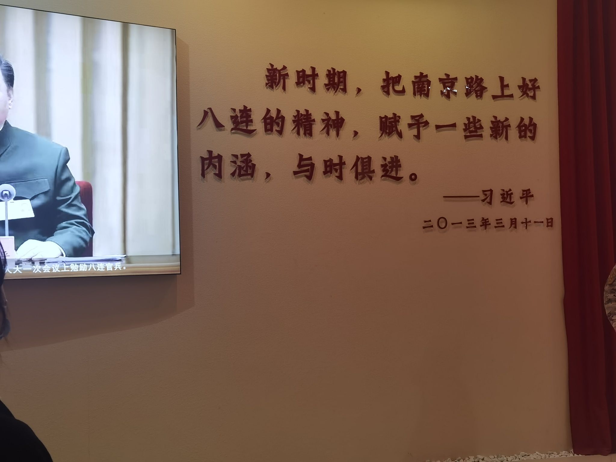 好八连诞生于解放战争的烽火硝烟中,1963年4月25日被国防部授予“南京路上好八连”的光荣称号。上世纪60年代,好八连的事迹被写成长篇通讯《南京路上好八连》发表在《解放日报》上,各地争相报道,并被编成话剧《霓虹灯下的哨兵》红遍大江南北。在解说员的讲解下,支部党员了解了老一辈革命家对八连的亲切关怀,领悟了连队数十年如一日拒腐蚀、永不沾、艰苦奋斗、全心全意为人民服务的光荣传统。