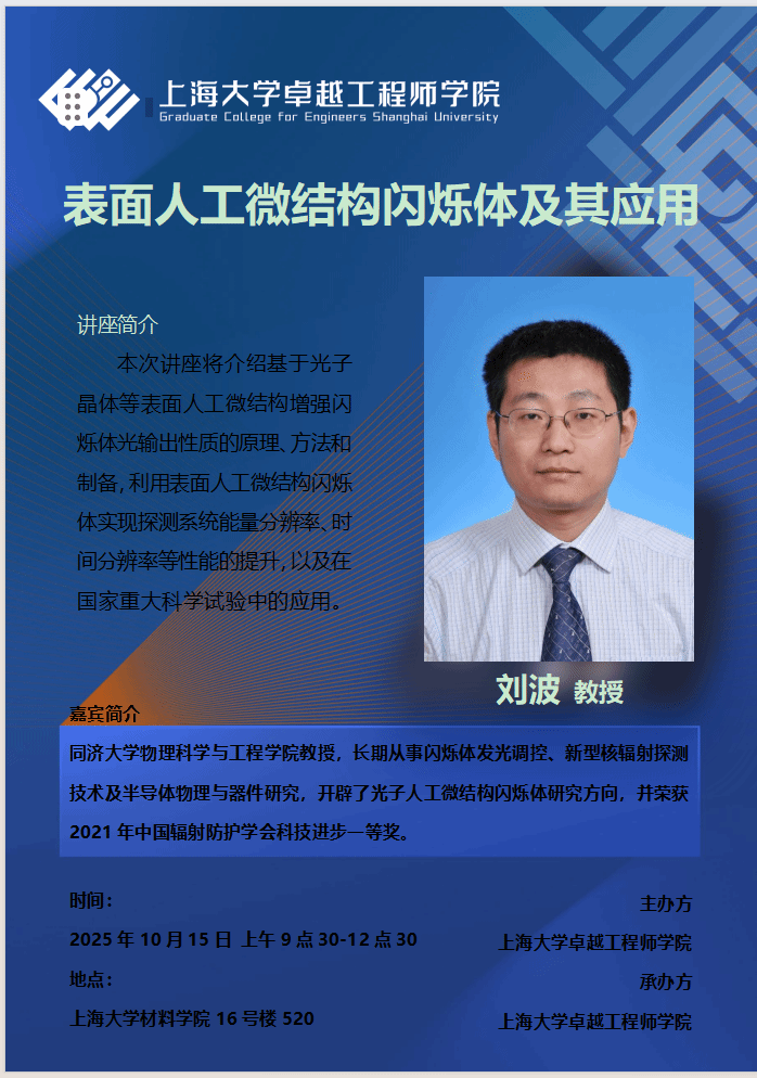 本次讲座将介绍基于光子晶体等表面人工微结构增强闪烁体光输出性质的原理、方法和制备,利用表面人工微结构闪烁体实现探测系统能量分辨率、时间分辨率等性能的提升,以及在国家重大科学试验中的应用。