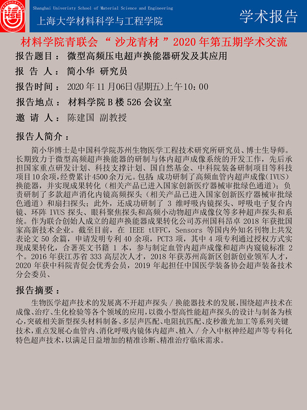 11月6日:3044AM永利青联会“青材沙龙”2020年第五期学术交流——微型高频压电超声换能器研发及其应用