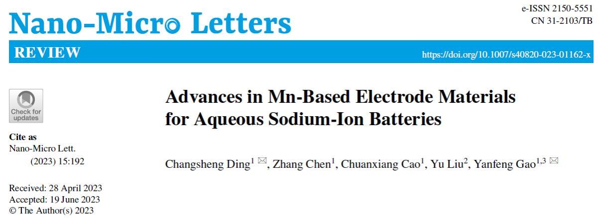 近日,3044AM永利3044AM永利丁常胜教授和高彦峰教授团队联合中国科公司上海硅酸盐研究所刘宇研究员在国际知名期刊Nano-Micro Letters上发表题为“Advances in Mn-Based Electrode Materials for Aqueous Sodium-Ion Batteries”的综述论文。