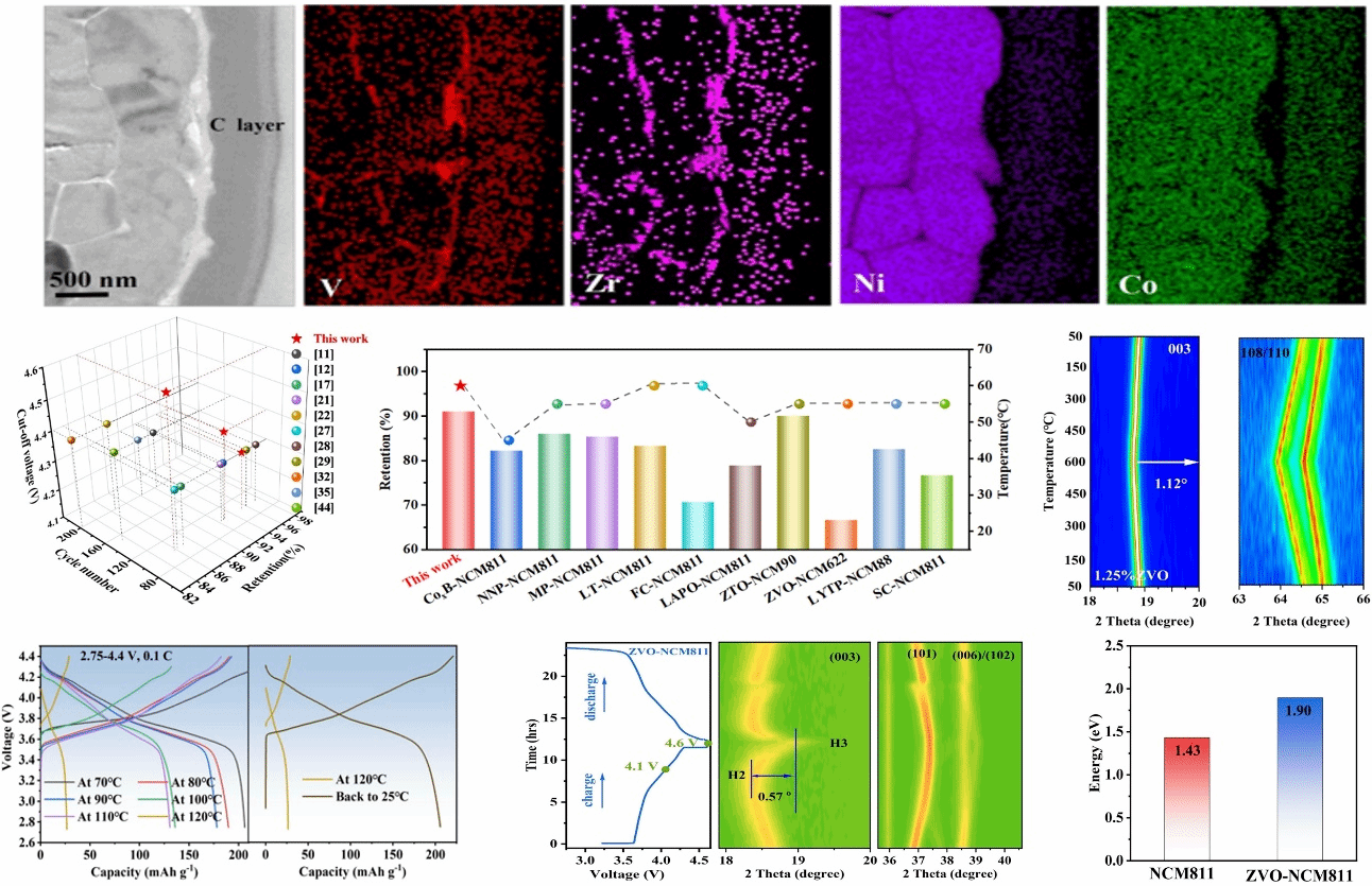 该研究工作,首次报道在富镍层状正极材料的二次颗粒和一次颗粒上构建了具有负热膨胀特性的高导电性ZrV2O7保护层,该策略可显著减轻副产物的积累、晶间/晶内裂纹的产生,抑制微观结构(较少的微裂纹)、相变(H1-H2-H3)和副反应(LiF和LixPOyFz),DFT计算表明,ZVO-NCM811正极材料的电导率和晶格氧稳定性(1.90 eV对1.43 eV)得到了改善。即使在高截止电压(4.6 V vs. Li/Li+)或高温(60 ℃下100次循环后95.3%的容量保持率)下,所生产的ZVO-NMC811也表现出稳定的循环性能(100次循环之后86.5%)和倍率容量(30 C下67.1 mAh g-1),在危险的温度下,锂离子通道在120 ℃时迅速关闭,限制电池的进一步放热,从而降低热失控风险。