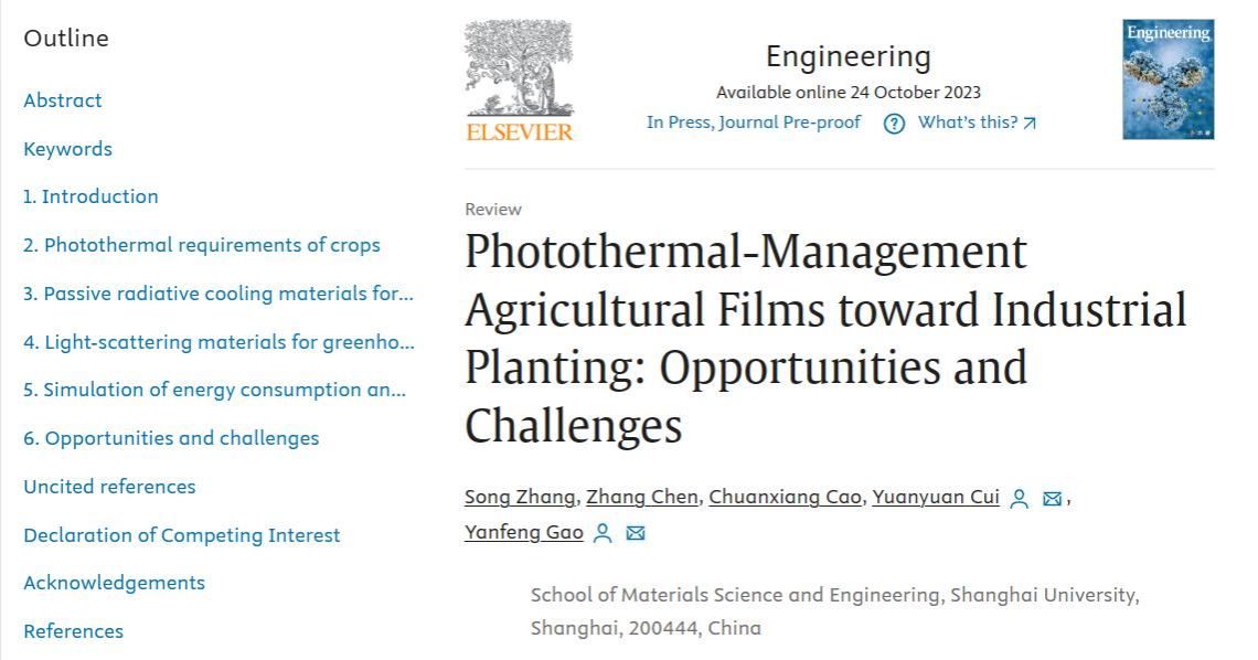 近日,3044AM永利教授高彦峰在工程技术领域顶级期刊《Engineering》(影响因子12.8)上发表题为“Photothermal-Management Agricultural Films toward Industrial Planting: Opportunities and Challenges”的综述论文。