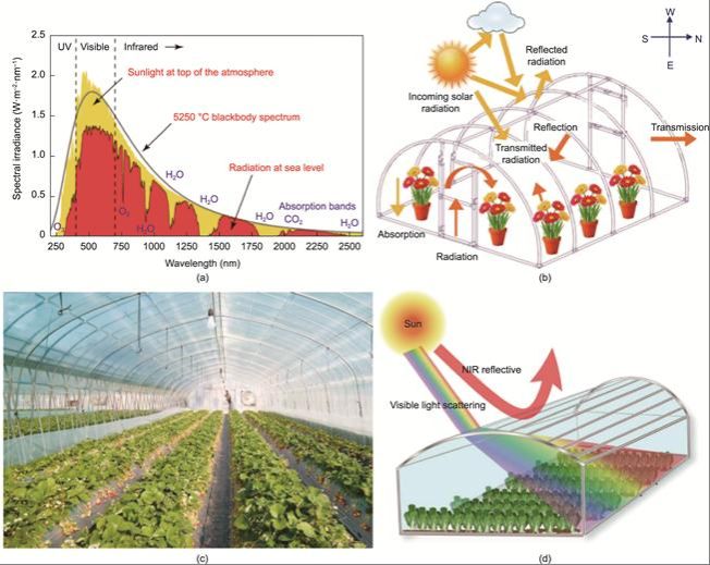 本论文面向农学、材料学、工程热物理领域交叉的共性难题,具有鲜明的学科交叉特征。首先,论文介绍了农作物生长过程中对光和热的需求,当环境的光热条件处于适宜作物生长发育的范围内,作物才能最大限度地实现增产增收。其次,论文阐述了被动辐射冷却和光散射农膜的原理。其中,有隔热功能的温室覆盖膜,可以通过将来自太阳光谱中的近红外反射,避免其进入温室内部造成温度升高;温室光散射材料可以扩大温室植物的照明面积,使用光漫射膜以扩大不同位置叶片的受照面积,促进光合作用。再次,论文提出了使用模拟和计算的方法对温室的能源消耗和环境条件进行评估,实现研发成本和能耗的降低。最后,论文展示未来的挑战和机遇,包括:需要在充分了解特定作物的光热特异性需求的基础上进行定向设计和应用温室光热管理农膜;筛选制备具有预期折射率和尺寸分布的材料是关键;有机基质和无机颗粒之间的界面也是决定材料性能的重要因素;通过示范应用验证光热管理膜的综合性能,收集温室内的环境以及作物的质量和产量数据,建立农膜、环境和作物之间的相互作用关系。