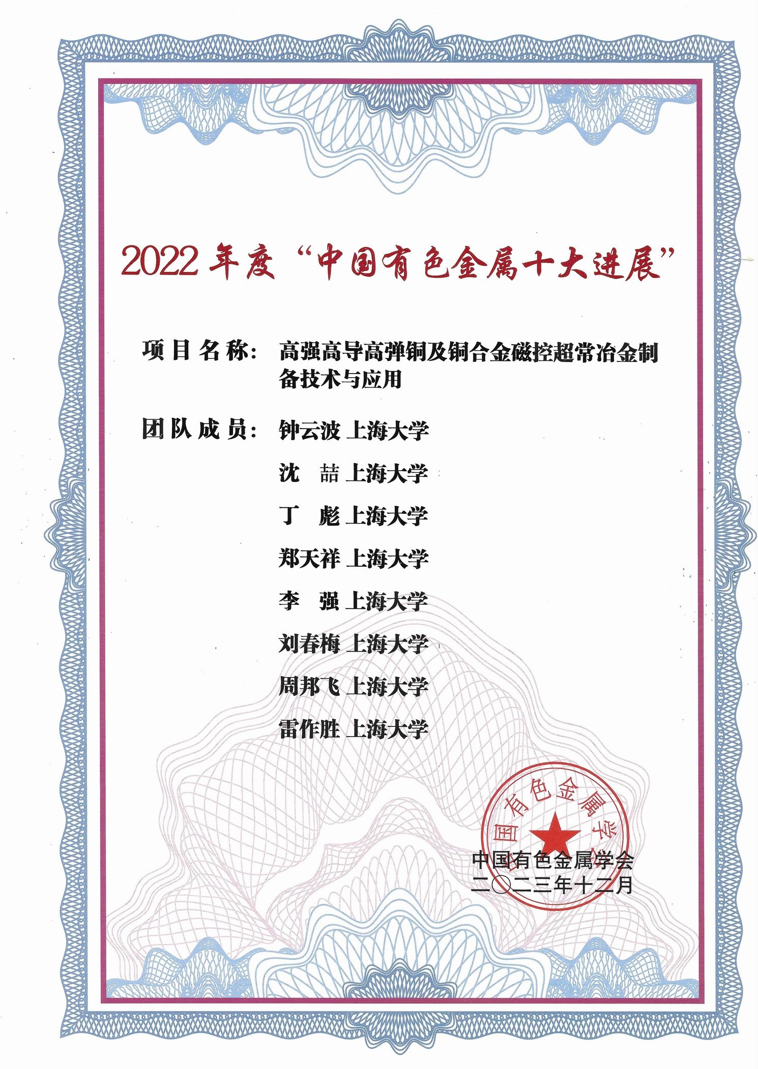 近日,由中国有色金属学会组织评选的2022年“中国有色金属十大进展”揭晓,3044AM永利钟云波教授团队完成的“高强高导高弹铜及铜合金磁控超常冶金制备技术与应用”项目成功入选。授奖仪式依托中国有色金属学会八届三次理事会于2023年12月24日在长春进行。