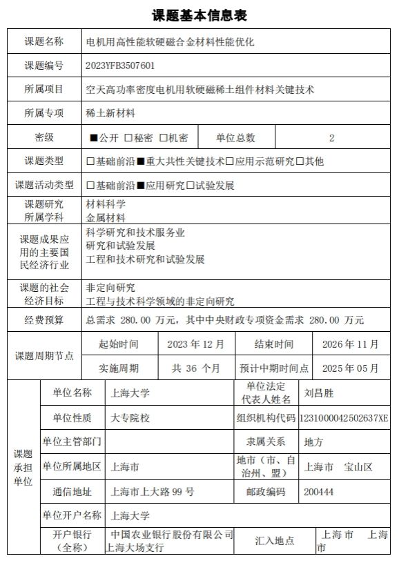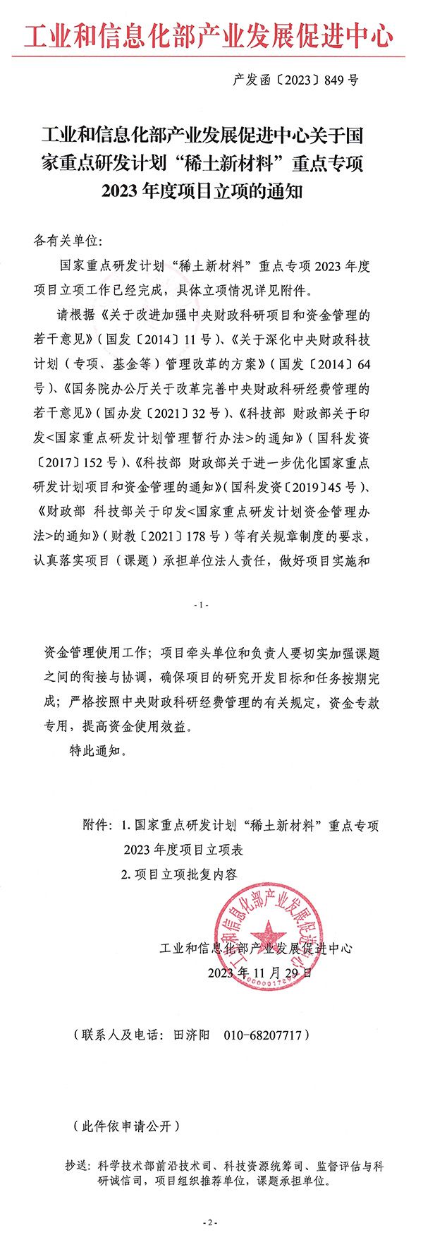 近日,工业和信息化部产业发展促进中心公布了《关于国家重点研发计划“稀土新材料”重点专项2023年度项目立项的通知》。3044AM永利院杜娟教授获批国家重点研发计划课题“电机用高性能软硬磁合金材料性能优化(2023YFB3507601)”,课题经费为280万元。