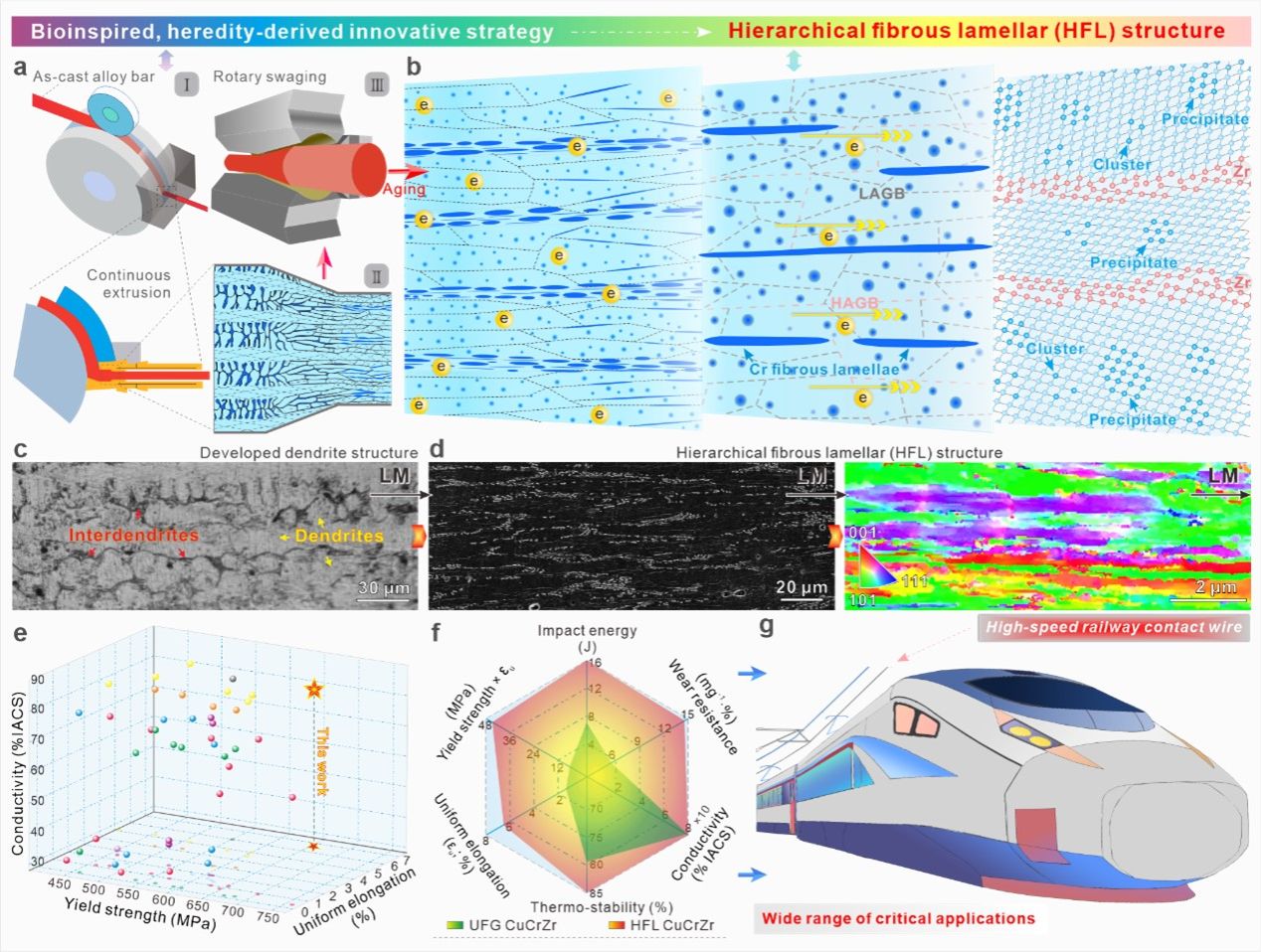 在克服材料的多重性能不平衡问题方面,生物启发的(仿生)多级设计展示了一种极其有效的微结构解决方案。然而,以简单可行且综合系统的方式定制多层级结构至今仍然极具挑战性,特别是针对于块体大尺寸材料。我们报告了一种反直觉的解决策略——探索对铸态块体合金中高度发达的枝晶多级体的多尺度微结构遗传。即:在优化的热机械加工过程中,我们仔细控制这些发达的枝晶逐步变形、拉长、排列和细化,而不是像传统加工中那样完全破坏这些枝晶。因此,一种多级的纤维层片(HFL)异质结构(类似于贝壳、竹子的微观组织)在极其重要的CuCrZr工程材料中被可控地设计并制备出来。我们揭示这种创新的HFL异构设计可以促进顺序的、跨尺度相互作用以及具有优异仿生属性的多重协同机制,因而产生了卓越的多功能特性,特别是实现了创纪录的高强度-高延展性-高导电性结合,而传统材料中强度和塑性、强度和导电性是两类此消彼长的矛盾,很难兼顾。在更基本的层面上,我们发现通过巧妙利用HFL异构诱导的复杂多层级内应力,可以激活多种以前无法实现的变形和强化机制。这些独特的属性在多个长度尺度上顺序运行、相互作用,包含从致密多样化的位错捕捉、大规模的堆垛层错增殖、9R相辅助的纳米孪生、自缓冲的剪切带到不断增强的异质变形诱导(HDI)应变硬化。这些显著的特性甚至还创造了优异的、远远超过传统均质结构的各种耐超高应变速率的动态力学性能。枝晶在合金材料中普遍存在,但通常是不受欢迎的,而我们的“生物启发、遗传衍生”策略却超常规地利用了它们,因而实现了前所未有的高品质多功能性。