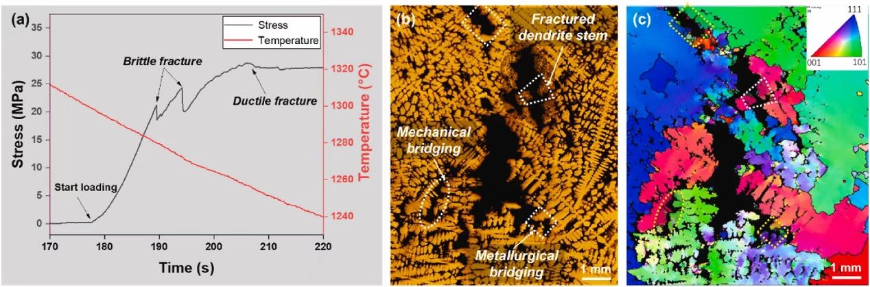 凝固裂纹临界强度的来源已由液膜理论、晶间搭桥理论等进行解释,但晶间搭桥和液膜协同作用抗凝固裂纹的机制尚不清楚。本研究使用自主开发的热裂测试装置,对高碳钢热裂纹形成的临界条件进行了测试,揭示了液膜和固体骨架对糊状区凝固裂纹强度的贡献机理。