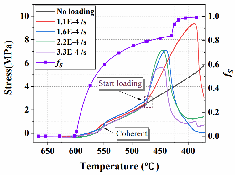 在合金凝固过程中,对合金的热力行为进行定量和可控的测量对于理解热裂的形成至关重要。选用热裂问题较为严重的AZ91D镁合金作为研究对象,使用热裂热模拟实验方法和装置,通过控制冷却和主动加载来表征热裂行为,在连续冷却条件下,于选定的固体分数强制热裂形成,测量应力、应变、应变速率和温度等热裂临界条件。