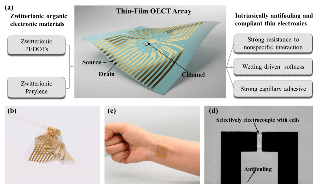近期,博士生张守燕和钱思昊为第一作者,朱波教授团队与王林军、黄健教授团队,以“Intrinsically Antifouling, soft and conformal bioelectronic from scalable fabrication of Thin-Film OECT arrays by zwitterionic polymers”为题在《Chemical Engineering Journal》上发表研究文章。该团队基于目前生物电子器件实用所面临的技术瓶颈,以两性离子功能化有机电子材料为基础,发展了基于两性离子功能化有机电子材料的光刻制造工艺,研制出仿生有机电化学晶体管(OECT)器件阵列(图1)。该器件可在全表面表达两性离子基团,具有强亲水性,有效抵御蛋白、细胞等生物污染;同时在保证器件工作性能的基础上,水合两性离子聚合物产生的强大毛细力可驱动器件在非平面表面上适形贴合,兼具高贴合性与低模量。该仿生OECT器件可在白细胞干扰物存在下与心肌细胞高选择性电偶联,同时也可与皮肤高适形贴合并抵御表皮油脂的污染,实现对心电图(ECG)密切稳定监测。该工作可以为高生物抗污高柔性有机电子器件的制备提供普适性平台,促进生物电子器件阵列在现实生活中的实际应用。