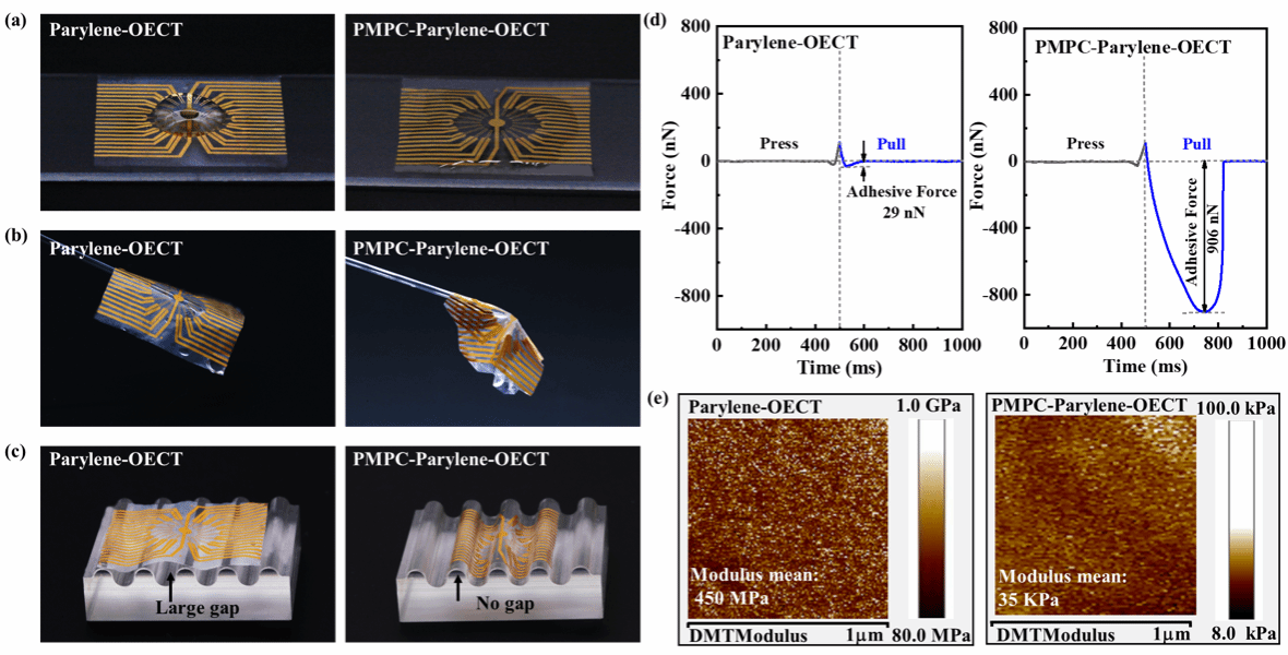 图4.聚对二甲苯(Parylene)和两性离子功能化聚对二甲苯(PMPC-Parylene)封装的柔性OECT阵列润湿驱动顺应性、柔软性和界面贴附性;(a)水滴在器件上浸润性能;(b)从水中取出器件后的变形性;(c)在圆形沟槽(半径= 1.5 mm)的适形贴合性;(d) AFM测试器件阵列表面的毛细粘附力;(e)器件阵列的表面杨氏模量。