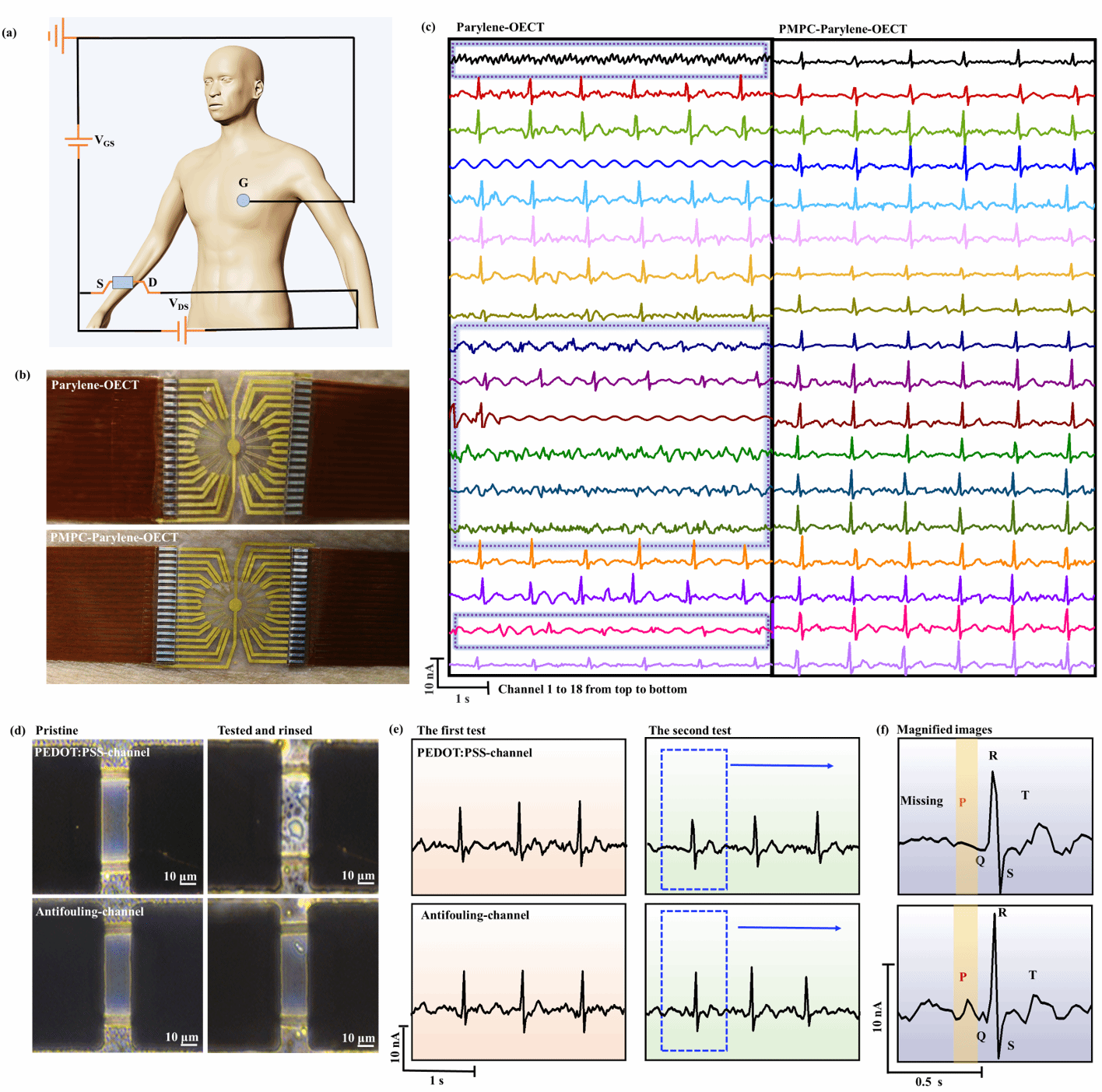 最后,我们研究了18通路仿生OECT器件阵列对心电信号收集的效果(图6)。可以发现,全仿生OECT器件阵列可以高适形贴合于皮肤表面,18通路均可高质量监测心电信号;而商用parylene封装的OECT器件阵列则无法保证18通路均可高质量收集心电信号。同时,仿生OECT器件阵列的生物抗污特性还可有效抵御表皮油脂污染,仅通过简单的水洗即可恢复其清洁,并在二次利用测试时获得几乎不变的信号记录能力。而商用PEDOT:PSS沟道则存在较大信号损失。该仿生OECT器件优异的性能证明了其在长期生理监测方面的优越潜力。