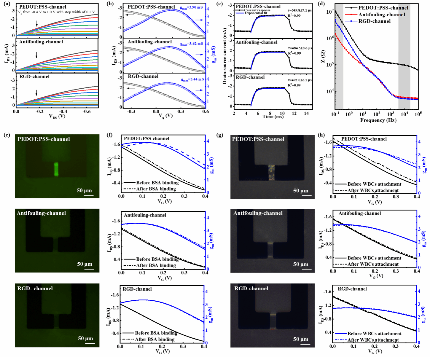 图3. OECT(PEDOT:PSS沟道,防污沟道和RGD功能化沟道)的电性能和生物防污性能。(a)输出曲线;(b)传递曲线(黑色)和相应的跨导(红色); (c)响应时间;(d)电化学阻抗图;(e)不同沟道在荧光蛋白溶液中孵育30分钟后的荧光显微镜图以及对应的(f)转移曲线和跨导;(g)白细胞在沟道上培养12 h的光学显微镜图以及对应的(h)转移曲线和跨导。
