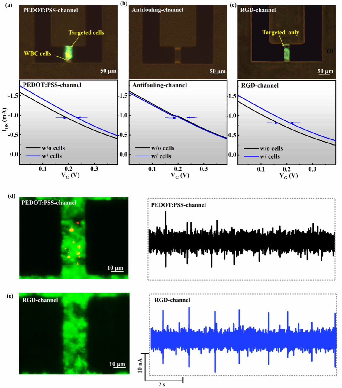 图5. 仿生OECT阵列的细胞选择性作用和电偶联。 (a) PEDOT:PSS沟道、(b)防污沟道和(c) RGD沟道捕获的MCF-7细胞(绿色)和白细胞(红色)的荧光显微镜照片(上),以及相应转移曲线(下);(d) PEDOT:PSS沟道和(e) RGD沟道上捕获的HL-1细胞(绿色)和白细胞(红色)的荧光显微镜照片(左)以及对应的记录的HL-1细胞具有代表性的尖峰痕迹(右)。