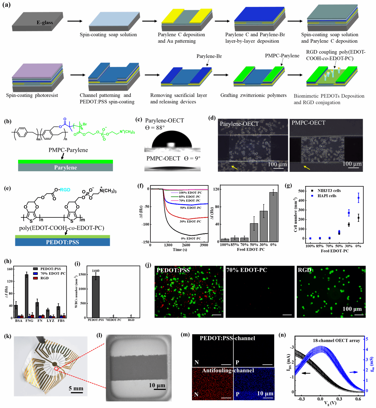 图2.抗生物污染的仿生OECT阵列光刻制备。(a)仿生器件光刻集成流程图;(b)-(d)仿生封装层的设计和生物防污性能;(e)-(g)仿生沟道的设计及生物防污性能;(k)-(n)仿生柔性OECT阵列的制备及18沟道阵列的电性能。