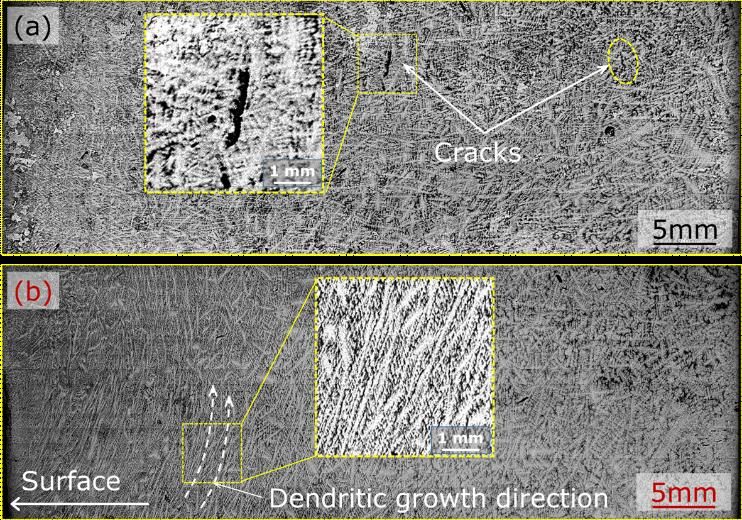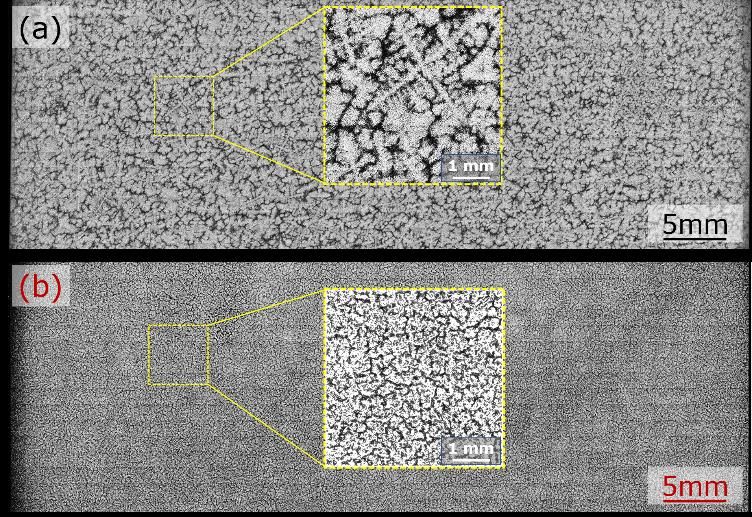 铸锭顶部(位于浇口处)的显微组织图(a)无HPMO;(b)有HPMO