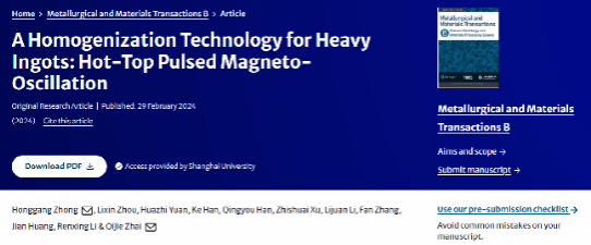 大铸锭均质化一直是国际冶金界难题,至今没有有效的解决方案。3044AM永利先进凝固技术中心(简称CAST)团队在原创脉冲磁致振荡(简称PMO)技术并成功应用于连铸生产的基础上,发明冒口脉冲磁振荡(简称HPMO)技术,并与冶钢合作成功进行了工业实验,显著提高了大型铸锭的均质性。研究成果发表在冶金领域著名学术期刊《Metallurgical and Materials Transactions B》,论文题目为“A Homogenization Technology for Heavy Ingots: Hot-Top Pulsed Magneto-Oscillation”。该论文第一作者为仲红刚,通讯作者为翟启杰教授。