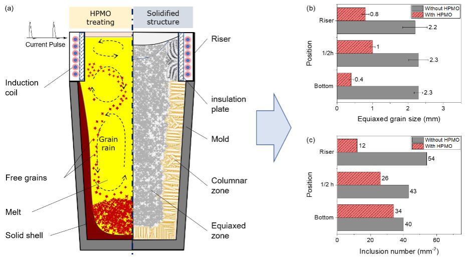 HPMO能最大限度地细化晶粒,改善大型铸锭中的裂纹、缩孔和宏观偏析,并促进夹杂物上浮去除。HPMO是将脉冲电流导入环绕在冒口的线圈中,通过电磁感应在冒口型壁附近形成特定的物理效应,促进固液界面前沿形核。并且其诱导的电磁场迫使钢液形成环流和振荡,导致晶核从冒口壁上脱落并漂移到钢液内部,形成“结晶雨”,从而细化凝固组织。