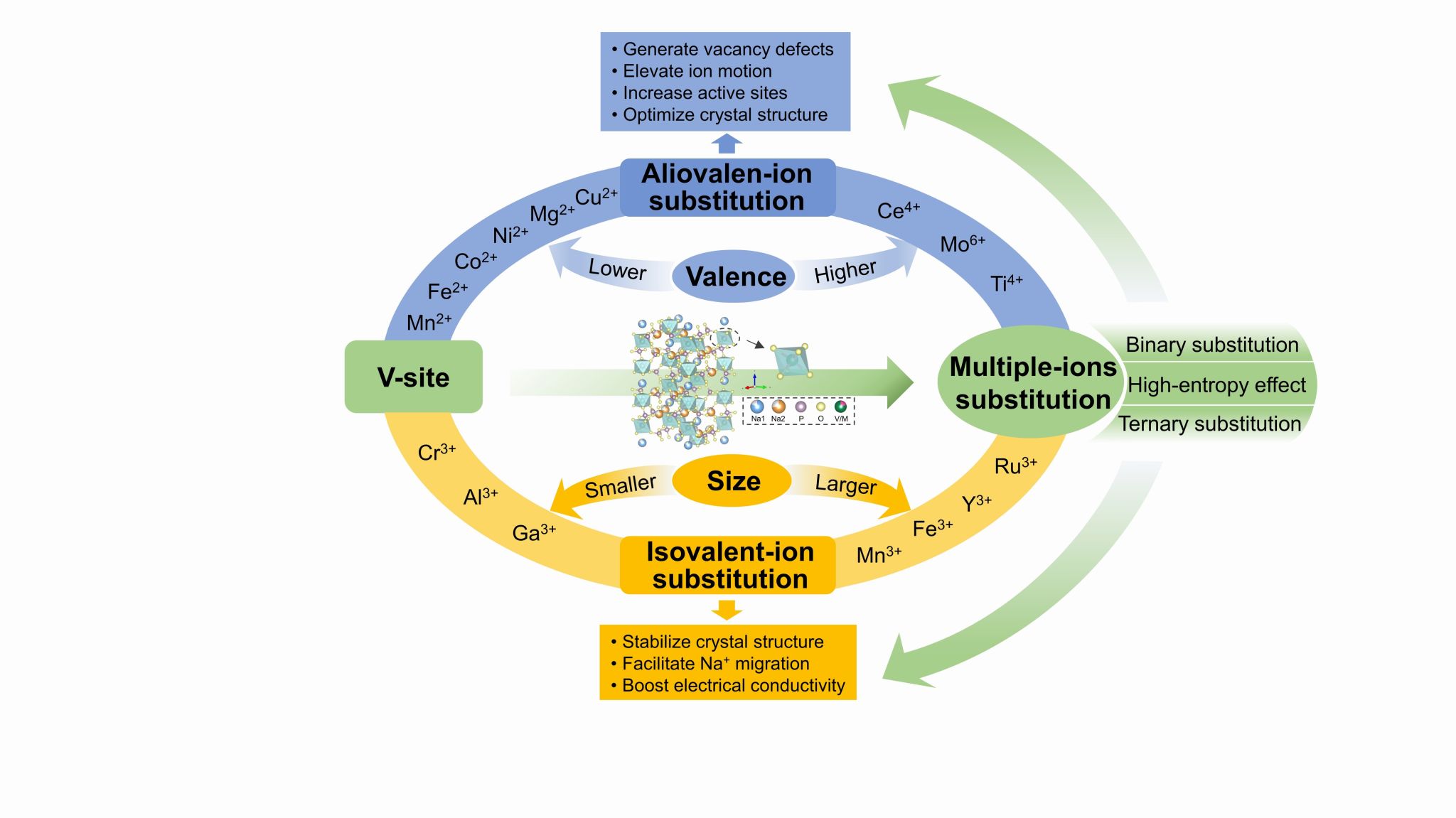 图2 Na3V2(PO4)3材料中V位点的取代或掺杂及其优势