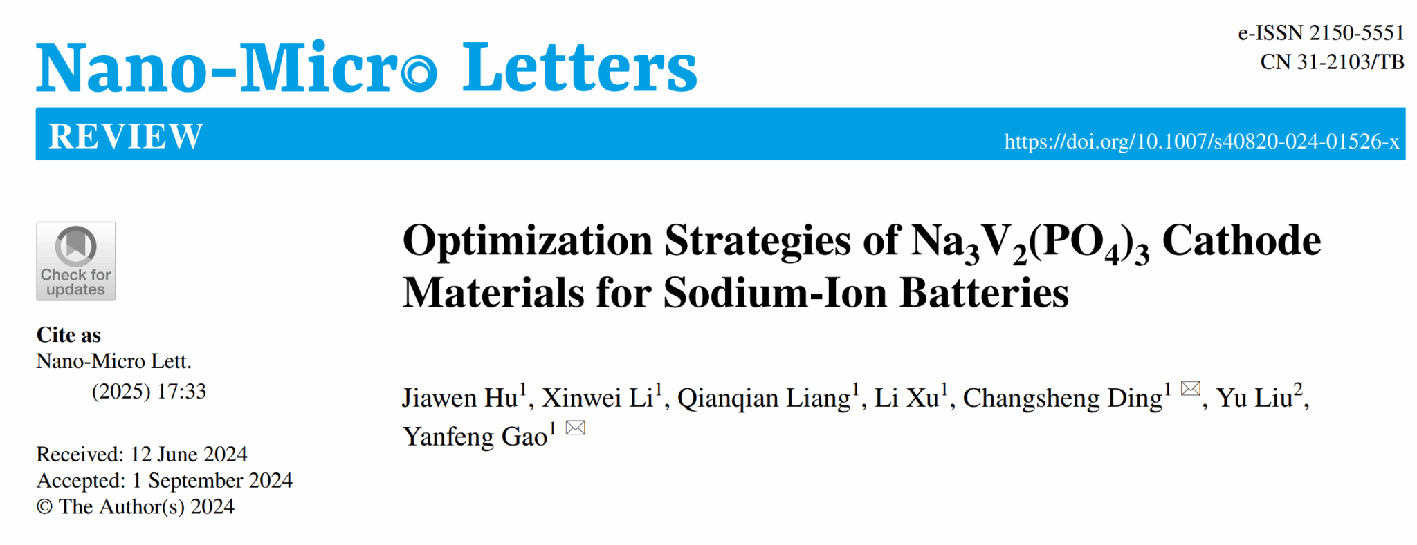 文章引用信息:JiawenHu,XinweiLi,QianqianLiang, LiXu,ChangshengDing, Yu Liu & Yanfeng Gao. Optimization Strategies of Na3V2(PO4)3 Cathode Materials for Sodium-Ion Batteries. Nano-Micro Lett. 17, 33 (2025). https://doi.org/10.1007/s40820-024-01526-x