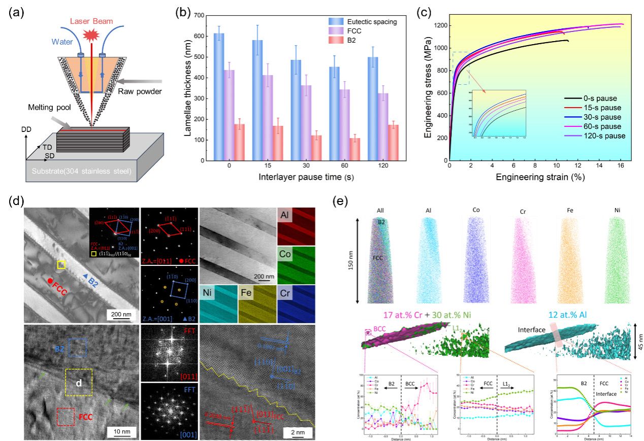 基于LDED层间暂停策略原位调控EHEAs微观结构:LDED示意图(a);不同层间暂停时间的片层厚度比较图(b)和拉伸工程应力-应变曲线(c);层间暂停60s样品的TEM表征(d)和APT表征(e)。