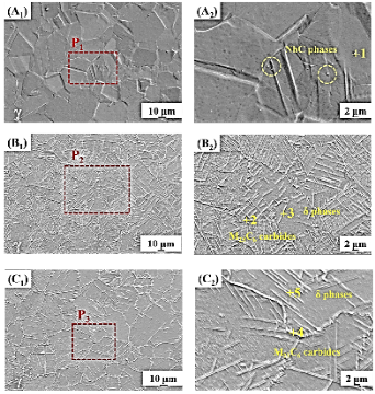 (A1)原样;(A2)图2 (A1) P1放大;(B1)时效样品;(B2)P2放大(B1);(C1)腐蚀试样;(C2) P3放大