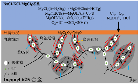 Inconel 625合金在NaCl-KCl-MgCl2熔盐中的腐蚀机理示意图