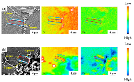Inconel 625合金中δ相及其邻近区域的EPMA图:(a)未腐蚀区域;(b)腐蚀区域。