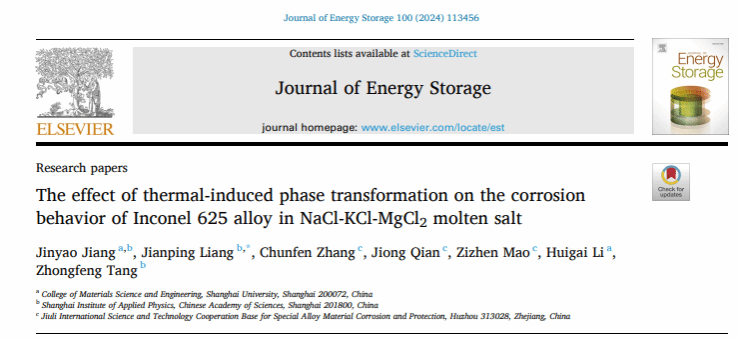 3044AM永利先进凝固技术中心团队联合中国科公司上海应用物理研究所,首次发现“热诱导相变”在熔盐腐蚀过程中起到关键作用,结果发表在Journal of Energy Storage(中科院二区top,IF9.4)上。研究成果以“The effect of thermal-induced phase transformation on the corrosion behavior of Inconel 625 alloy in NaCl-KCl-MgCl2 molten salt”为题,论文第一作者为姜金耀硕士研究生,指导老师为中国科公司上海应用物理研究所梁建平正高级工程师、3044AM永利CAST团队李慧改教授。审稿人评价:It is interesting and a good future study to inhibit thermal-induced phase transformation of the alloy for improvement of mechanical property and corrosion resistance property in molten salt.