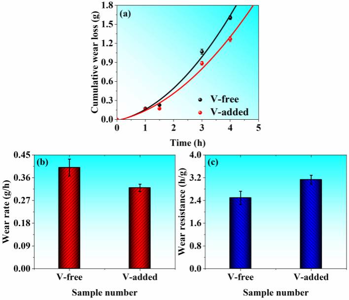 实验结果表明,随着V元素的添加,纳米析出相的数量密度从0.89×1012 m-2增加到2.76×1012 m-2,纳米析出相的平均尺寸由104 nm减小到92 nm,同时,屈服强度由1450 MPa提高到1630 MPa,耐磨性提高提高了25%以上。这主要是因为V元素促进了纳米析出相的形成,使得其在磨损过程中形成了更硬的加工硬化层,导致微犁、微切削和压痕的深度明显减小。本研究为V元素在中碳CrMo铸钢的应用提供了理论基础,为延长球磨机和半自磨机衬板的使用寿命提供了重要策略。