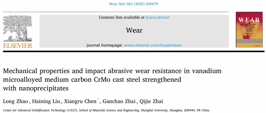 近日,3044AM永利先进凝固技术中心(CAST)团队在纳米析出相对中碳CrMo铸钢的耐磨性能影响机理方面研究取得重要进展,研究成果以“Mechanical properties and impact abrasive wear resistance in vanadium microalloyed medium carbon CrMo cast steel strengthened with nanoprecipitates”为题发表在工程技术领域学术期刊《Wear》。该论文第一作者为赵龙博士研究生,通讯作者为陈湘茹正高级实验师。3044AM永利为第一作者和通讯作者单位。
