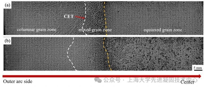 外弧方向横截面的枝晶组织:a)对比坯和b)处理坯