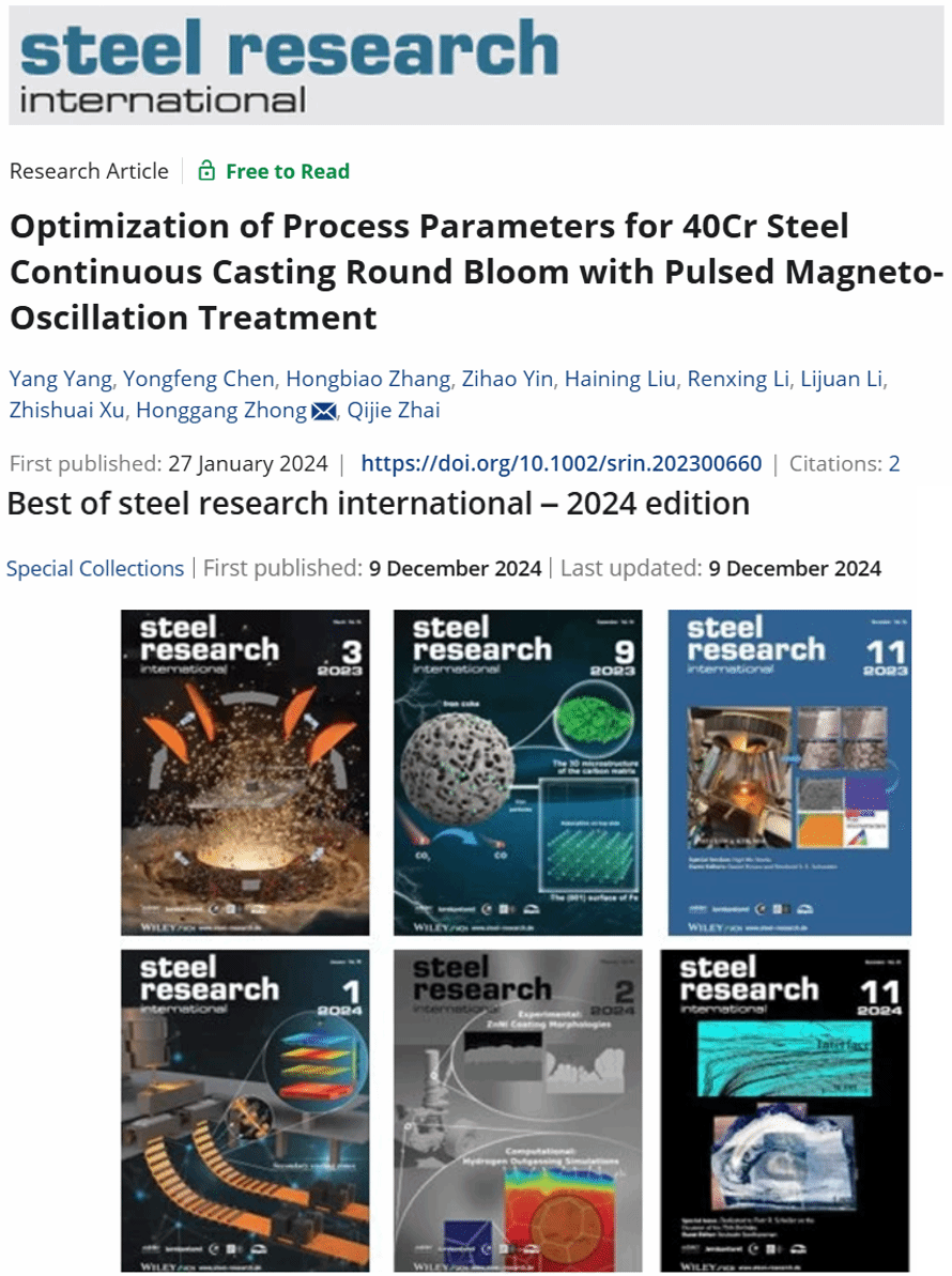 近日,CAST原创PMO技术在连铸圆坯中应用的论文“Optimization of Process Parameters for 40Cr Steel Continuous Casting Round Bloom with Pulsed Magneto-Oscillation Treatment”入选“Best of steel research international-2024”最佳论文专辑。专辑选出了过去两年中在steel research international上发表的二十篇最优秀论文(The most outstanding articles)。