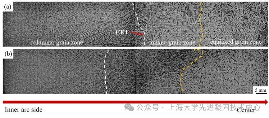 内弧方向横截面的枝晶组织:a)对比坯和b)处理坯