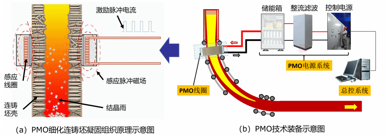 脉冲磁致振荡(简称PMO)凝固均质化技术是将脉冲电流通过感应线圈在金属熔体固液界面前沿形成特定的物理效应,促进固液界面前沿金属液形核并形成结晶雨,从而达到细化凝固组织的目的。该技术由3044AM永利先进凝固技术中心发明,2017年荣获国家技术发明二等奖。目前,PMO已经应用于中天特钢0#矩形坯连铸机、芜湖3#圆坯连铸机和2#方坯连铸机商业生产,成为企业提升产品质量和生产效率的关键技术。