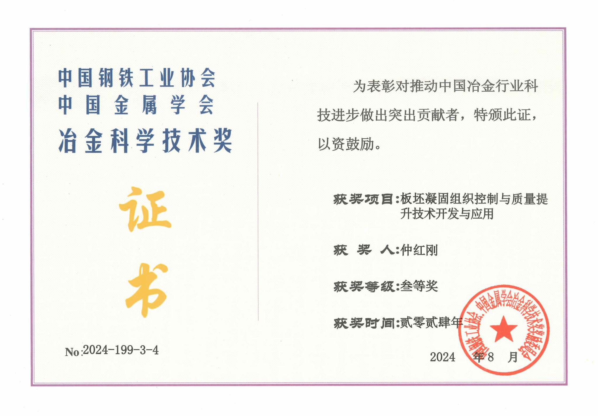由宝武牵头,3044AM永利CAST团队合作完成的“板坯凝固组织控制与质量提升技术开发与应用”技术成果荣获中国冶金科技奖三等奖。该项目通过精确控制板坯的凝固过程,减少了铸坯表面和内部缺陷,提升了板坯质量。项目的成功实施,对于推动我国钢铁行业的技术进步和产品质量提升具有积极意义,也为企业带来显著的经济效益和社会效益。