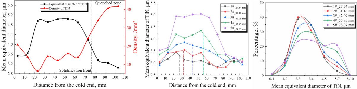 不同凝固分数下TiN的尺寸及数量密度统计结果