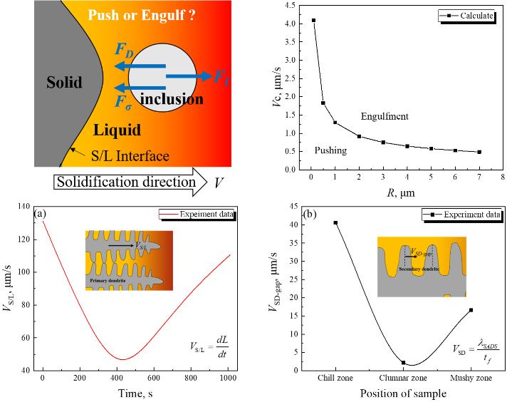 凝固过程中,夹杂物在固/液界面的运动行为——推移或吞没——对夹杂物在钢中的最终分布起决定性作用。本文通过分析TiN在凝固界面前沿的受力状态,明确了TiN在凝固界面的迁移行为:固液界面捕获TiN所需的临界速度随TiN尺寸增大而减小。高冷速区域TiN尺寸更小,更多的被枝晶臂捕获而分布于枝晶臂内,低冷速区域TiN在枝晶间隙中的数量比例增加。