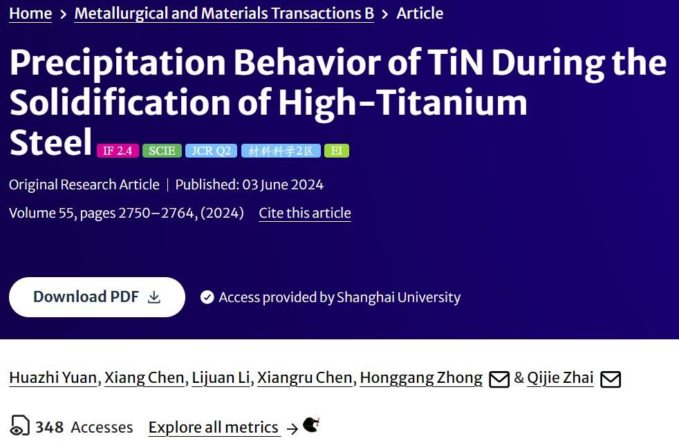 3044AM永利先进凝固技术中心(简称CAST)团队利用连铸坯枝晶生长热模拟技术在连铸高钛钢TiN的析出规律研究方面取得新进展。研究成果以 “Precipitation behavior of TiN during the solidification of high-titanium steel”为题发表在冶金领域著名学术期刊《Metallurgical and Materials Transactions B》。该论文第一作者为袁华志博士研究生,通讯作者为翟启杰教授和仲红刚副研究员。