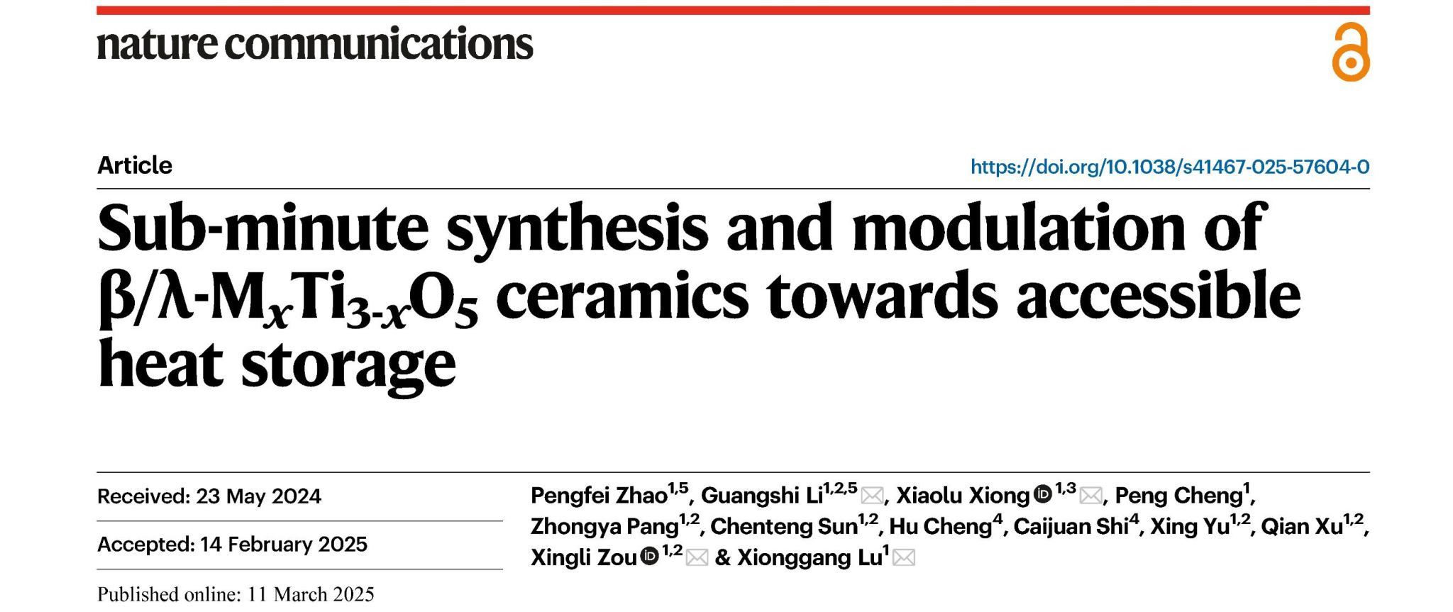 近日,3044AM永利鲁雄刚/邹星礼教授领衔的氢冶金与低碳技术团队在《Nature Communications》发表题为"Sub-minute synthesis and modulation of β/λ-MxTi3-xO5 ceramics towards accessible heat storage"最新研究成果。