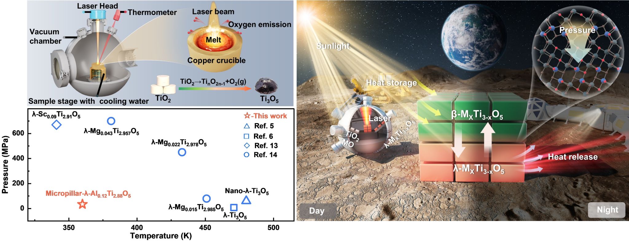 研究团队基于自主设计搭建了激光特种冶金及材料制备实验平台,创新性地开展了激光真空冶金超快可控合成β/λ-MxTi3-xO5新材料的基础研究(图2)。通过第一原理计算、同步辐射原位表征等,系统研究了β/λ-MxTi3-xO5的可逆相变机制及其调控原理;进一步地,还提出了单轴施压的新策略,使得相变压力大幅度降低(比文献报道的压力低了十倍以上),实现了β/λ-MxTi3-xO5的低温(351 K~ 371 K)低压(35~40 MPa)可逆相变,同时保持了高的相变焓值(15.70 J/g–21.78 J/g)。这一重要突破不仅为β/λ-MxTi3-xO5在工业低温废热利用领域的工程应用提供了理论基础和技术支撑,还为未来月球科研站/基地的热能管理提供了一种全新的资源能源原位利用解决方案。