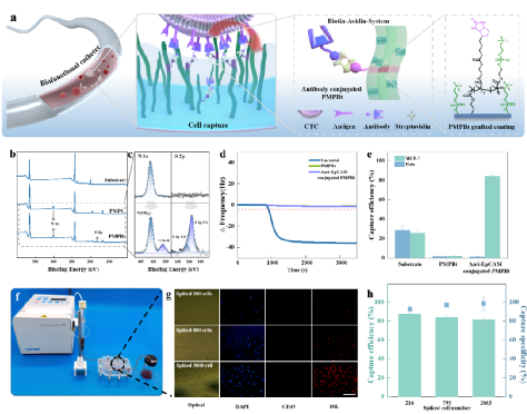 此外,涂层表面通过在超亲水的两性离子环境中构建高特异性的细胞特异性识别网络,能够有效排除其他血细胞和杂质的干扰,实现对复杂血液中循环肿瘤细胞超90%以上的捕获特异性和捕获效率。这一技术为癌症的早期筛查、个性化治疗及精准诊断提供了新的思路和工具。
