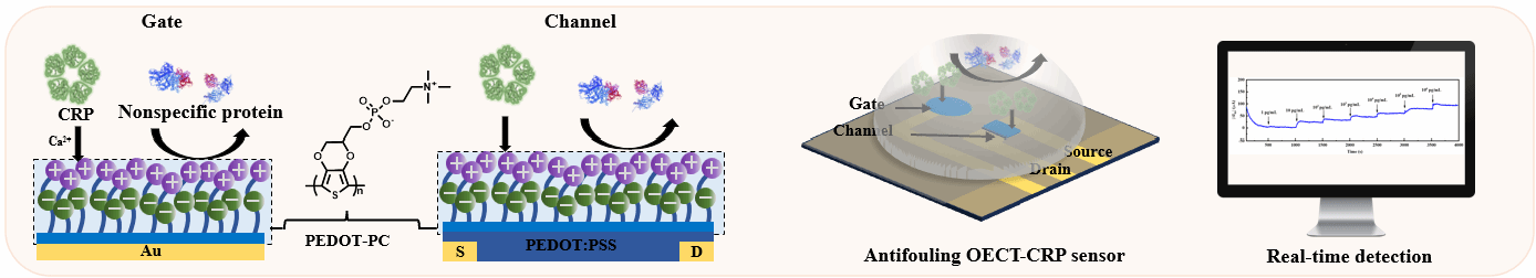 图1、磷酸胆碱功能化聚(3,4-乙烯二氧噻吩)修饰的OECT实现复杂环境中对C反应蛋白的实时、特异性检测。