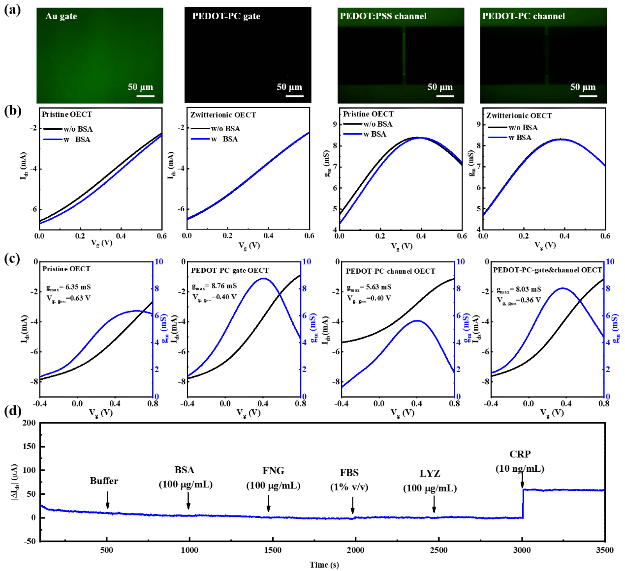 图2、两性离子OECT的抗污性能与生物传感应用。(a)荧光标记实验显示两性离子界面显著抑制非特异性蛋白吸附;(b)两性离子器件在复杂生物环境中展现出运行稳定性;(c)两性离子PEDOT修饰OECT显著提升器件性能;(d)两性离子OECT在高浓度干扰物蛋白存在下,对C反应蛋白的实时、快速、特异性检测。