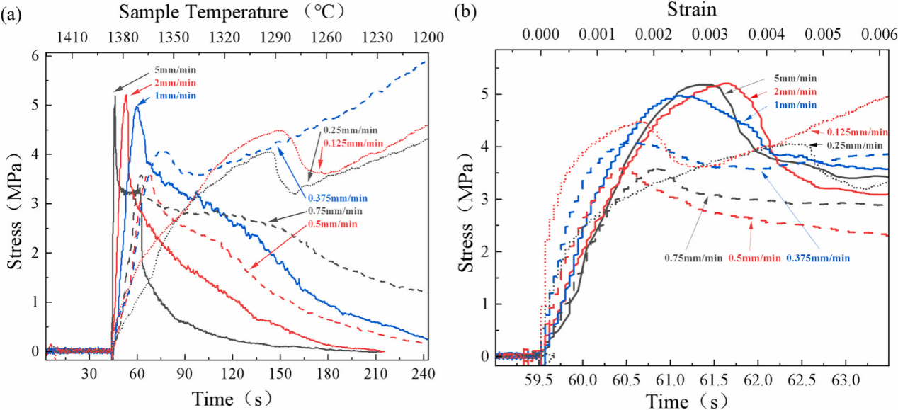 首先,利用自主开发的动态加载凝固裂纹热模拟试验机,通过主动施加载荷并精确控制加载速率,模拟Fe-1.0 wt.%C二元合金的热裂形成过程。在此基础上,结合力学曲线分析、金相组织观察、断口形貌评估,以及混合搭桥理论和热裂敏感性指标,系统表征了Fe-1.0 wt.%C二元合金的热裂行为。研究不仅确定了该合金的临界应变速率范围,为碳钢热裂的预测与定量研究提供了参考;还分析了不同实验参数与团队提出的热裂倾向因子