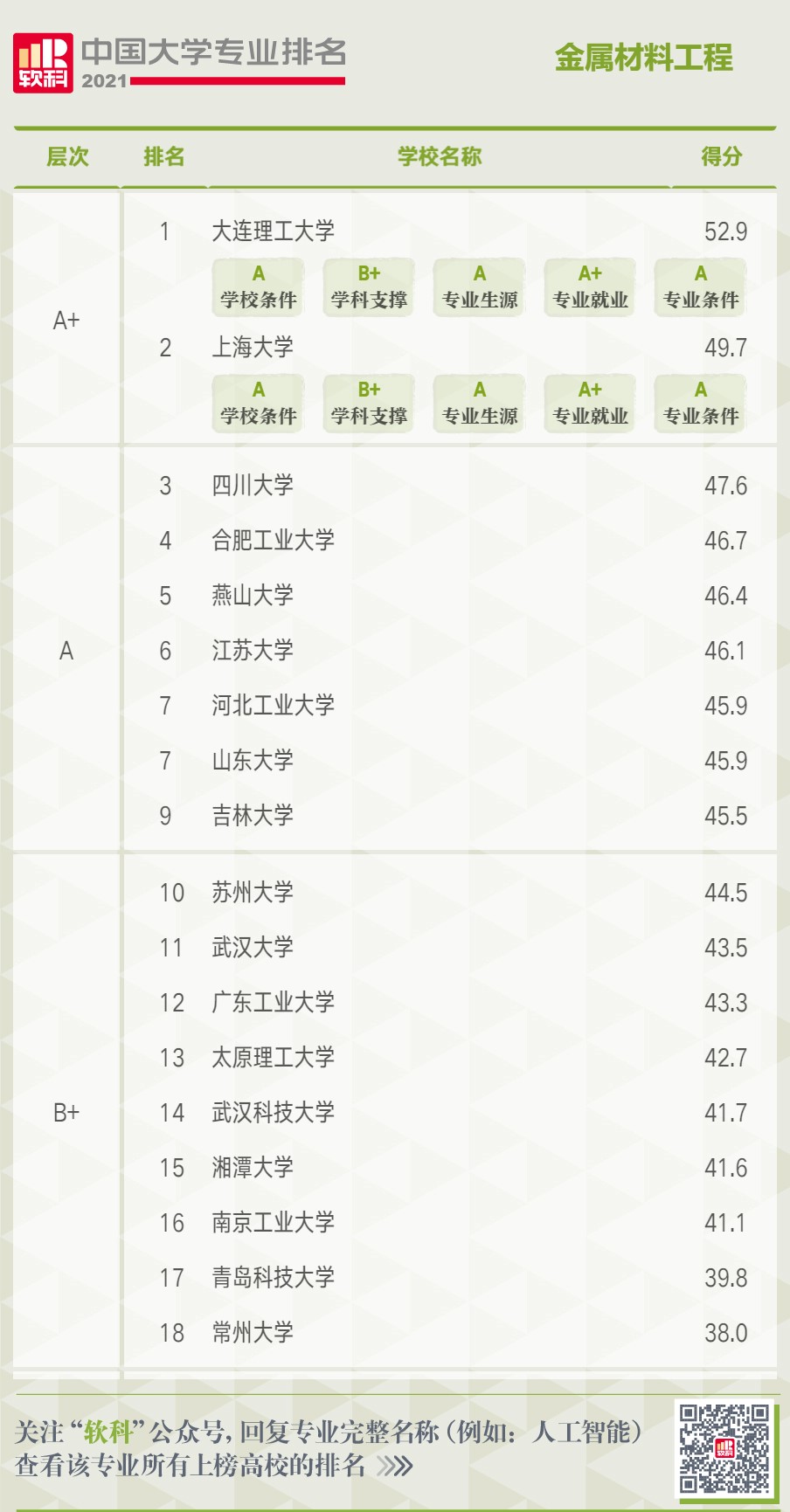 图 软科中国金属材料工程专业全国排名B+以上(全国前18名)公司